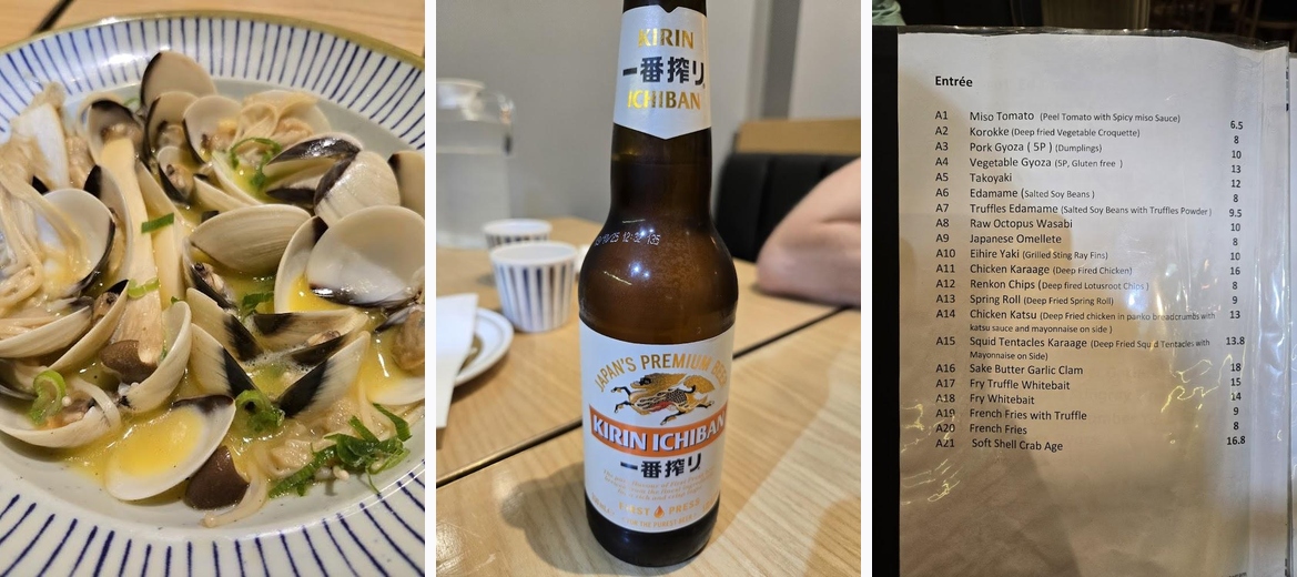 Cute little local Japanese restaurant in the area. Plenty of parking round dinner time as you can park near the galleria. Sashimi was fresh and the cut was good value for money, I really liked the flavouring they used for the lotus chips. Best dish for me was the sake butter garlic clams, I would come back for just that dish. The sauce was amazing, clams and mushrooms were perfectly cooked.